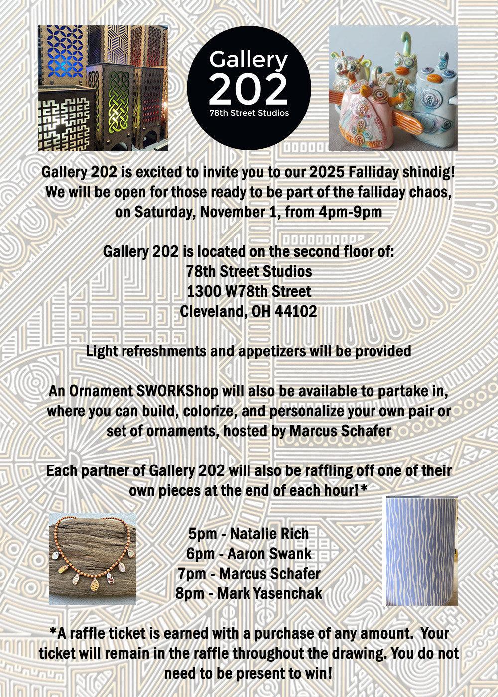 Saturday, November 1st: 12 - 9 PM *4-9PM Gallery 202 Falliday Shindig featuring an Ornament Workshop with Marcus Schafer and a raffle each hour from owners Natalie Rich, Mark Yasenchack, Aaron Swank, and Marcus Schafer!